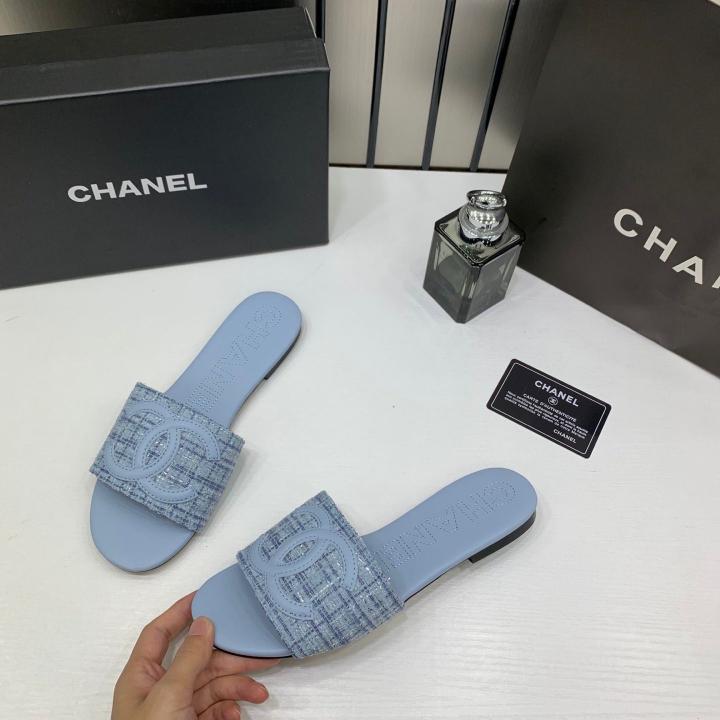 Chanel Blue Tweed CC Slipper Flat Light Blue With OG Box & Carry Bag 1892 LT Blue
