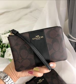 Coach Corner Zip Wristlet In Signature Brown Canvas With Black Stripe With OG Box & Dust Bag 103