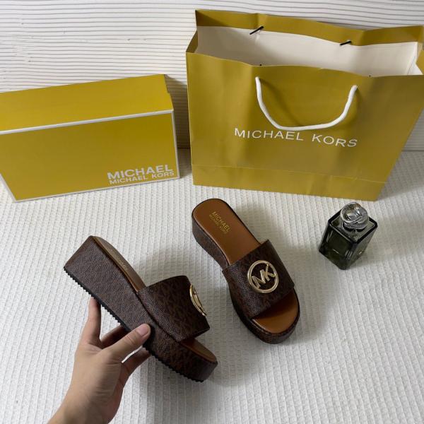 Michael Kors Sadler Logo Jacquard Wedge Sandals With OG Box & Carry Bag 6622-3 Brown